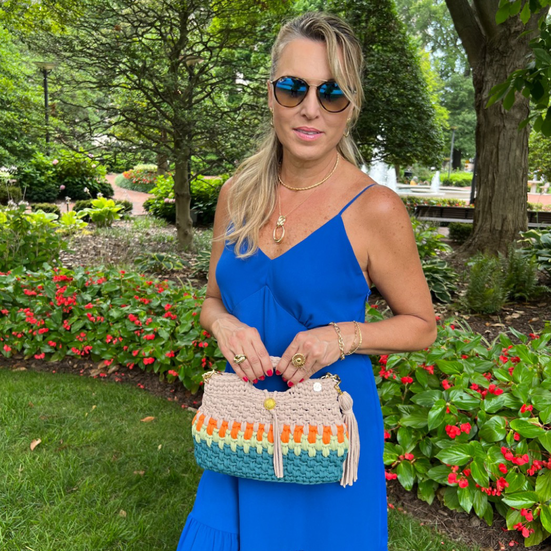 This fashionable bag is a great addition to your wardrobe. Its is perfect for any outfit. Whether you are wearing plain, neutral or colorful, the bag different yarn colors gives you a stylish look.